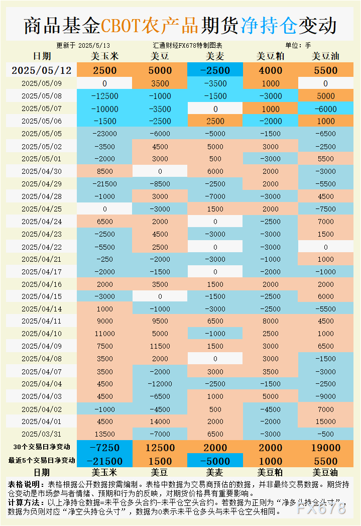 增加CBOT玉米投机性净空头;增加CBOT大豆投机性净多头;增加CBOT小麦投机性净空头;增加CBOT豆粕投机性净多头;增加CBOT豆油投机性净多头;